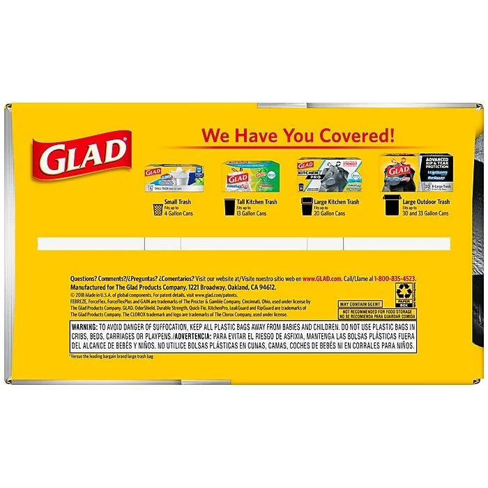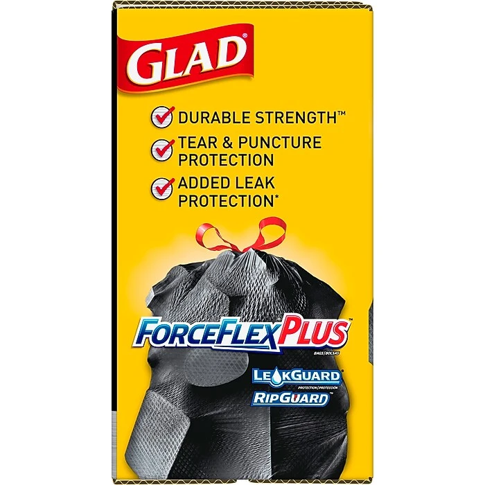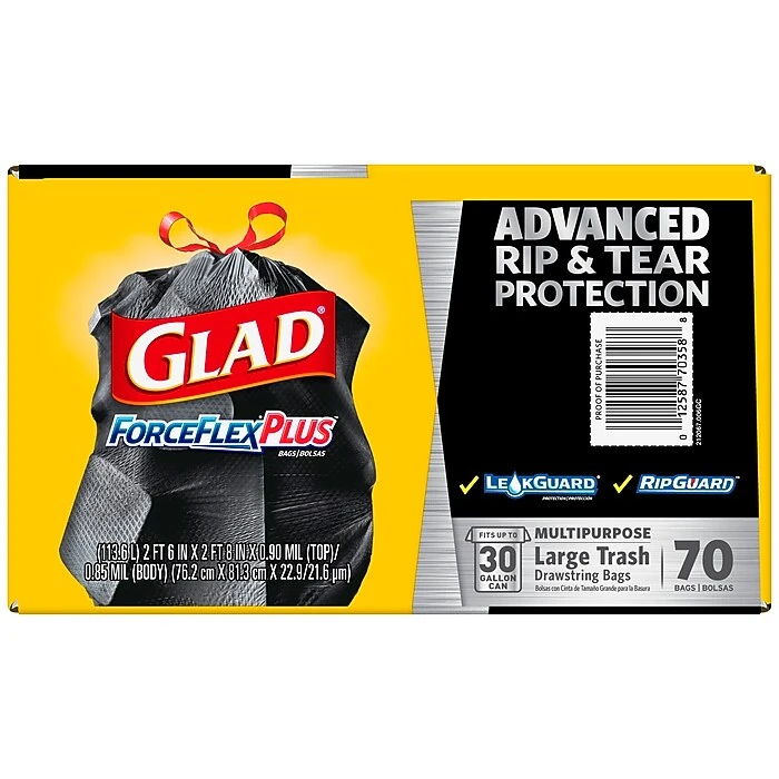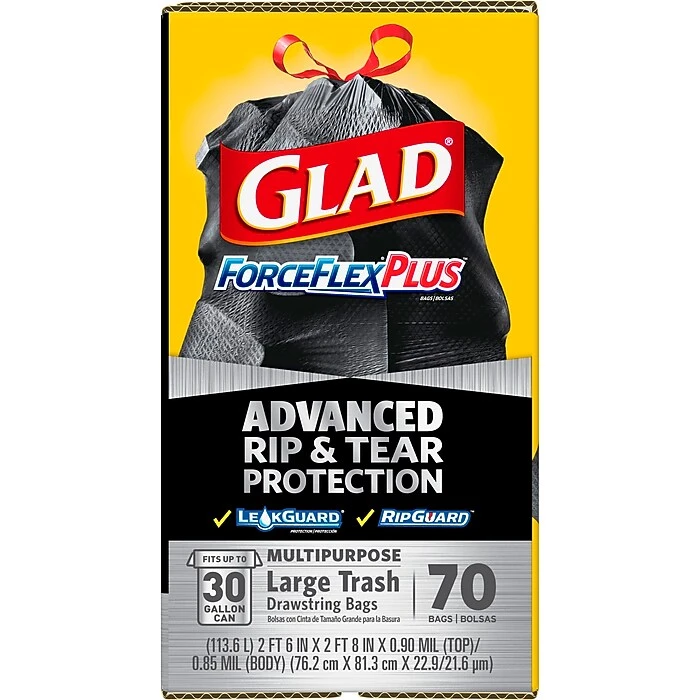 Glad® ForceFlexPlus⢠Drawstring Bags are designed with Durable Strength⢠with a reinforced side seam to let you carry the heaviest loads without tearing the bag. The large capacity bags fit a 30 gallon can and stretche around your trash with the ForceFlexPlus⢠technology to prevent rips and tears. Built with advanced rip and tear protection, the LeakGuard⢠Protection and RipGuard⢠Protection can withstand even the toughest and messiest trash, so that what goes in, stays in. The strong reinforcing drawstring closure grips the can and ensures easy closing and lifting with one quick pull. These garbage bags are perfect for tough jobs throughout your home or office, indoor or outdoor. Ideal for use in restaurants, offices and other commercial facilities. Take out the trash with Glad® reliability and guaranteed stretchable strength.