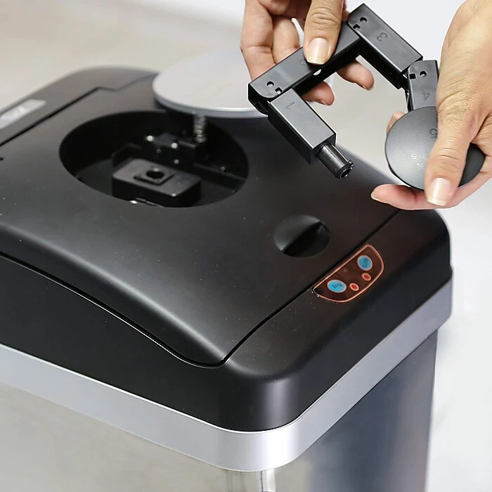 - Sensor-activated, automatic lid. High-quality ABS plastic. Powered by four D size batteries (not included) or AC Adapter (sold separately).