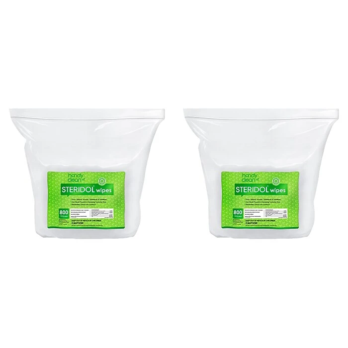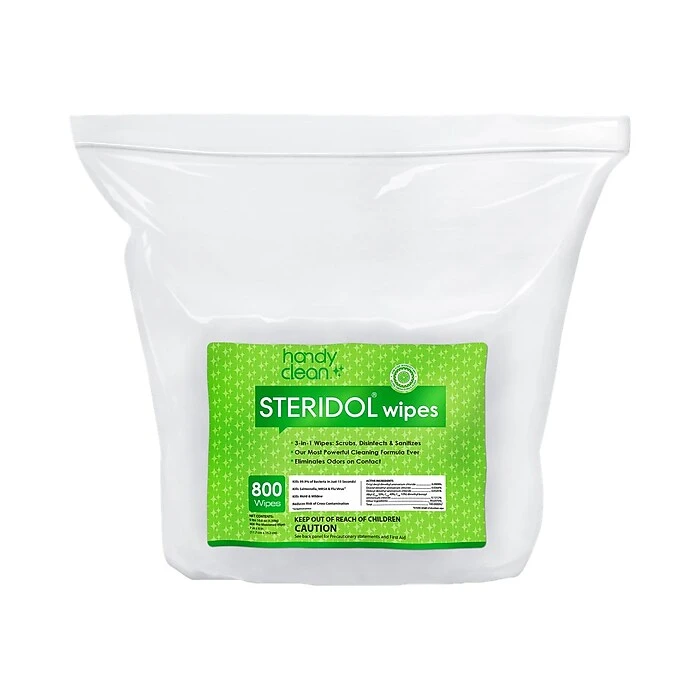 Handyclean Steridol disinfecting wipes scrub, disinfect, and sanitize with a powerful cleaning formula. They eliminate odors on contact and kill 99.9% of bacteria in just 15 seconds. Kill salmonella, MRSA, and flu virus, and reduce risk of cross-contamination.