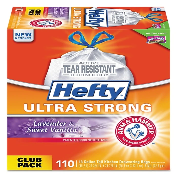 Patented Arm & Hammerâ„¢ Odor Neutralizer eliminates garbage odors without adding any unwanted scents or fragrances; leaves your kitchen smelling the way you want. Convenient drawstring closure makes handling trash quick and easy.