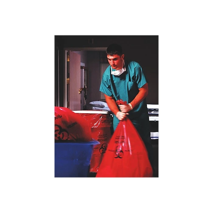 Mark your company garbage for proper disposal with this 100-count box of red printer liners. The bags are contractor strength to handle heavy loads, and the flat pack dispenses one bag at a time. These Heritage red liners are printed, which makes it easy to identify your healthcare waste.