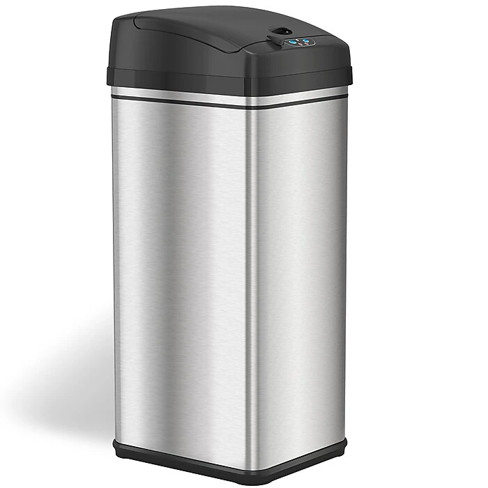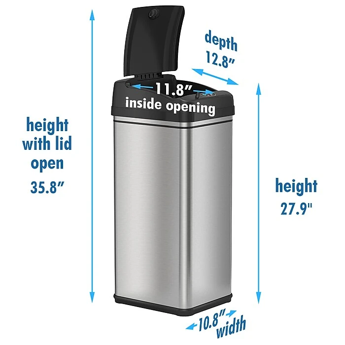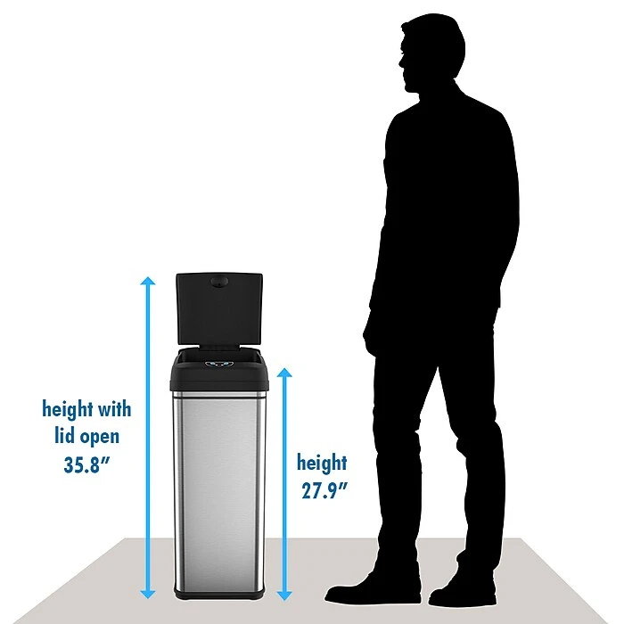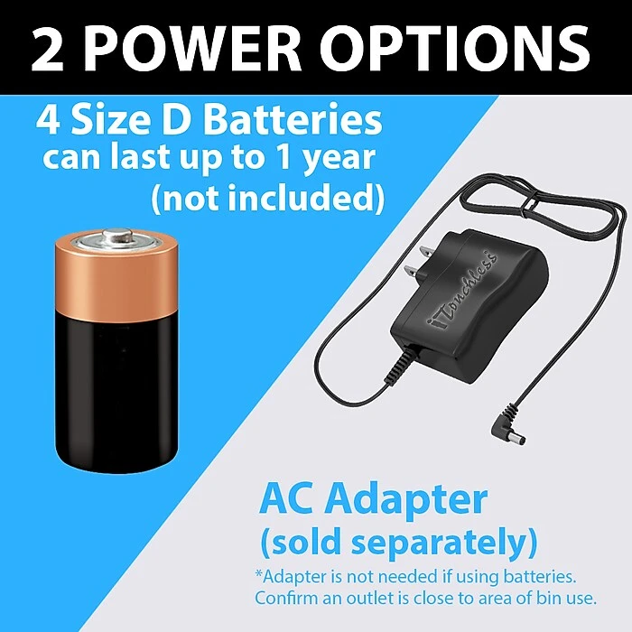 - Sensor-activated, automatic lid. High-quality ABS plastic. Powered by 4 D size batteries (not included) or AC Adapter (sold separately).
