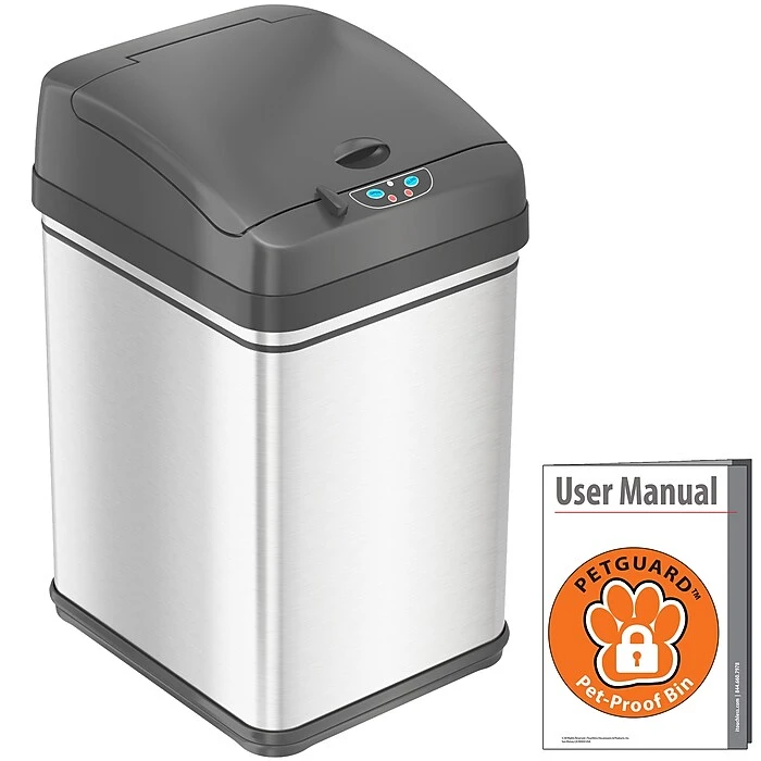 - Sensor-activated, automatic lid. High-quality ABS plastic. Powered by 4 D size batteries (not included) or AC Adapter (sold separately).