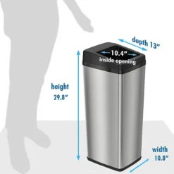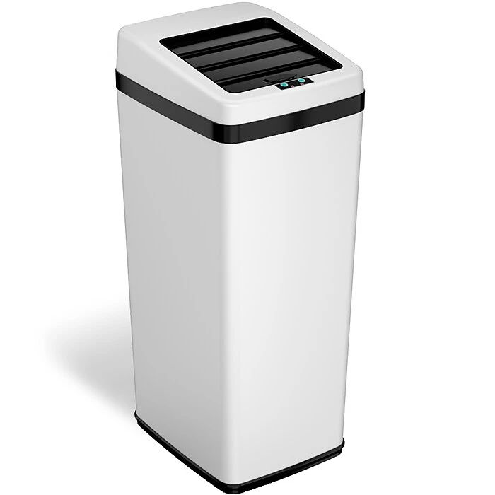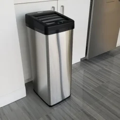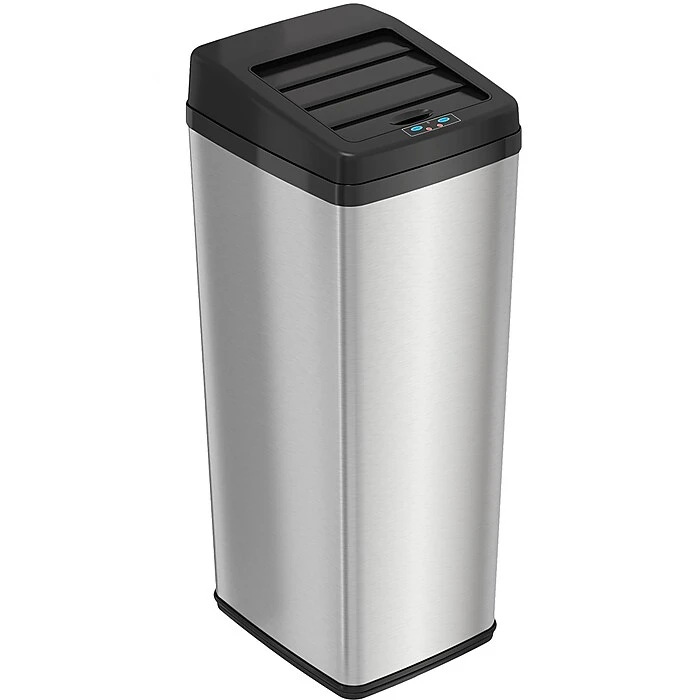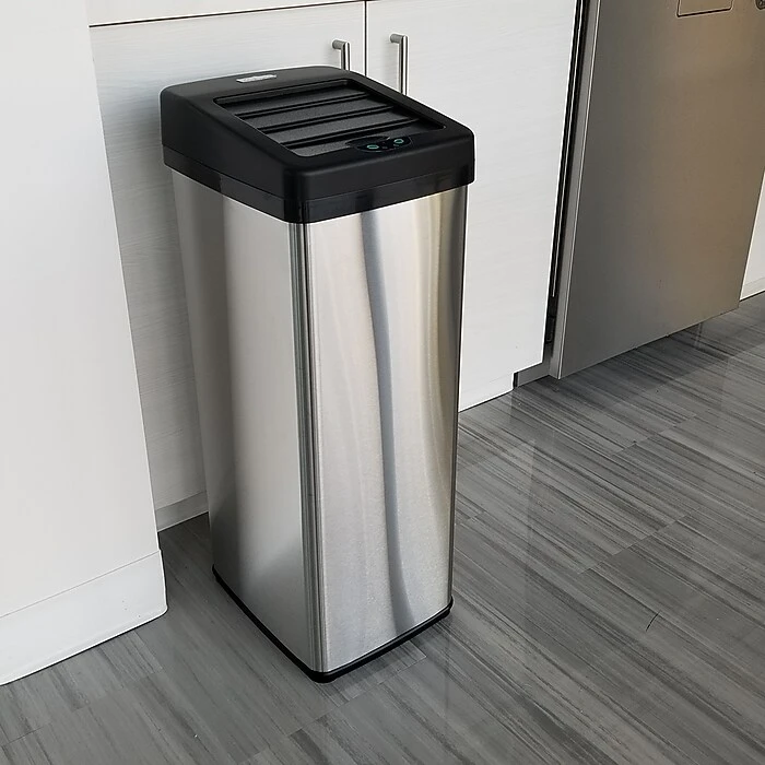 - Sensor-activated, automatic lid. High-quality ABS plastic. Powered by four D size batteries (not included) or AC Adapter (sold separately).