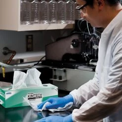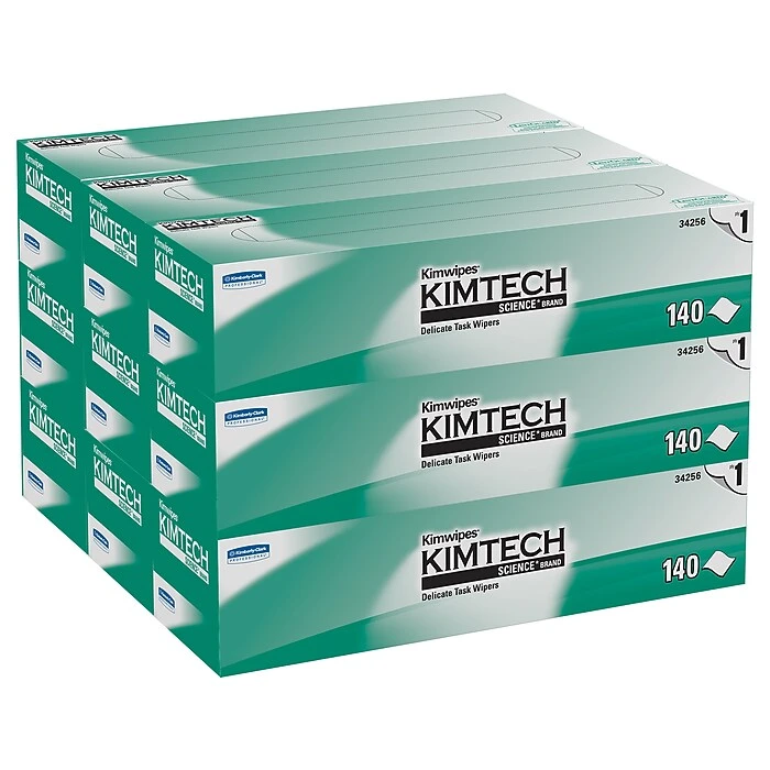 Polish glass and metallic surfaces with these light-duty wipers. The 14.7 x 16.6-inch size of these Kimtech Science white wipers quickly clears liquids and tiny particles from sensitive items such as lenses and laboratory instruments, and the antistatic dispensing system minimizes lint and electrostatic discharge.
