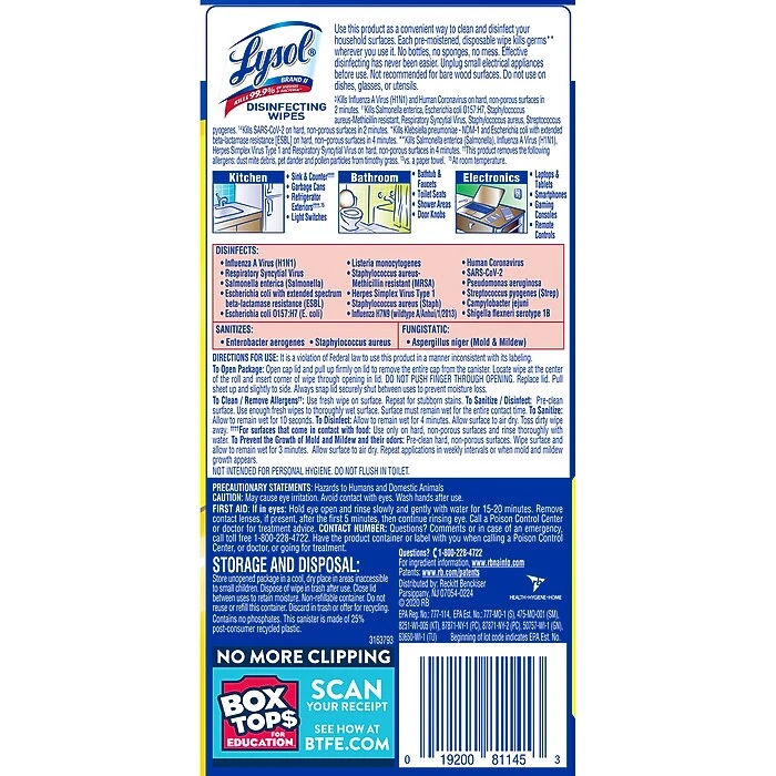 - Kills 99.9% of viruses and bacteria, including cold and flu viruses, Salmonella, E. Coli, MRSA, RSV, Staph, and Strep, when used as directed on hard, non-porous surfaces.