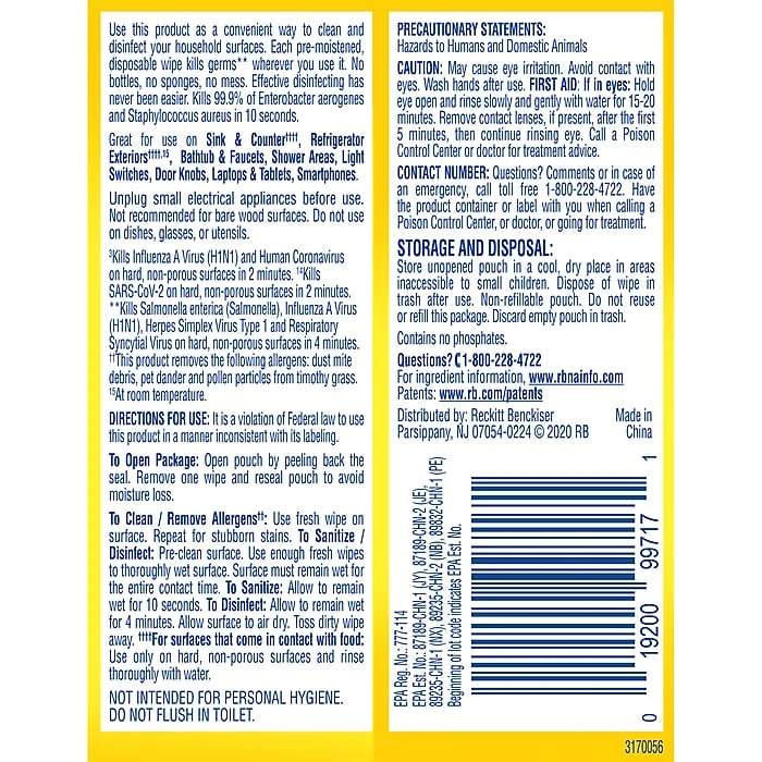- Kills 99.9% of viruses and bacteria, including cold and flu viruses, Salmonella, E. Coli, MRSA, RSV, Staph, and Strep, when used as directed on hard, non-porous surfaces.