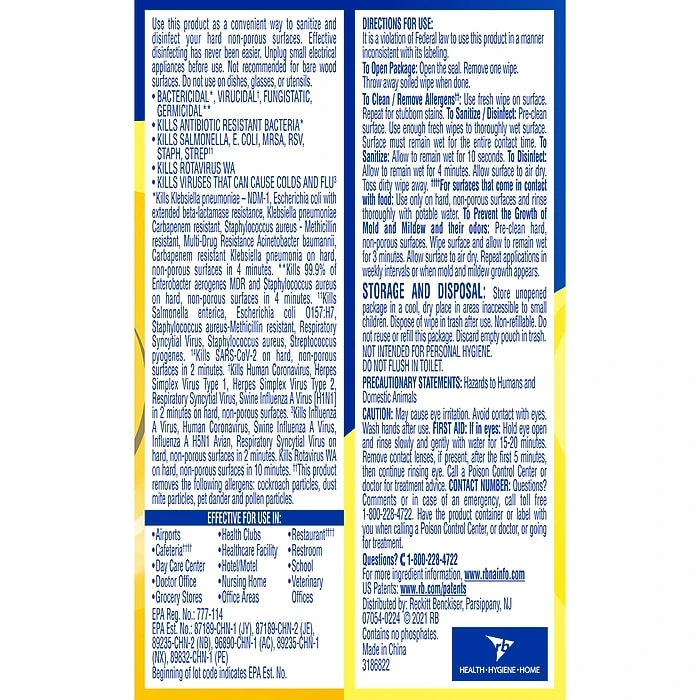 - Kills 99.9% of viruses and bacteria, including cold and flu viruses, Salmonella, E. Coli, MRSA, RSV, Staph, and Strep, when used as directed on hard, non-porous surfaces.