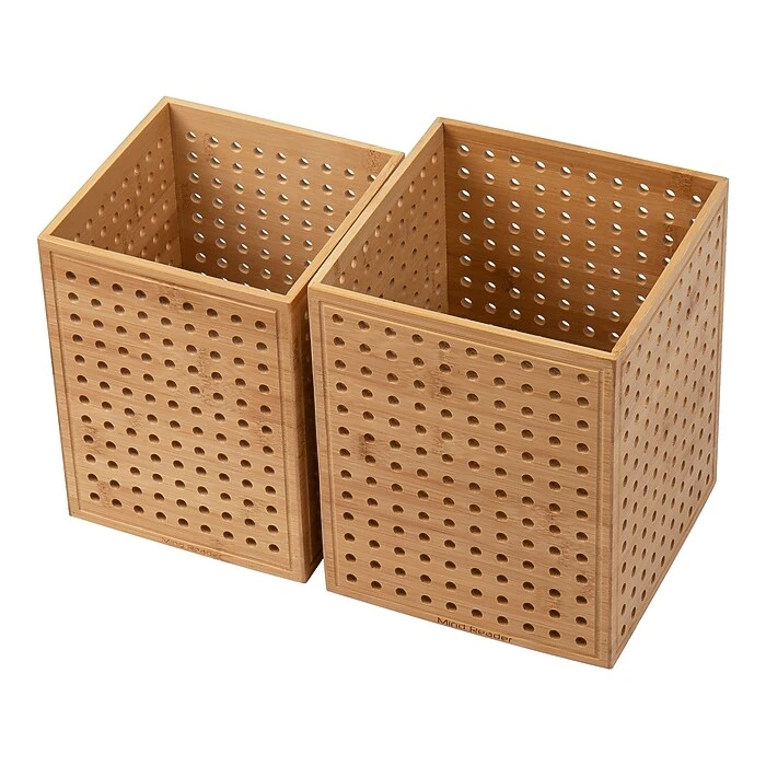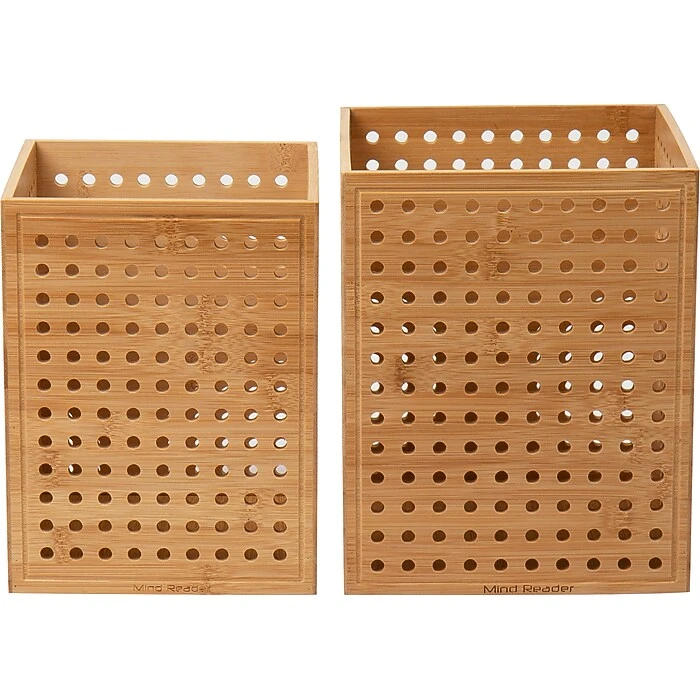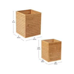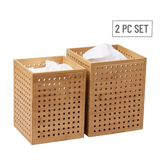 Place this Mind Reader wastebasket set in a place that would benefit from an elegant touch of decor and the practicality of a sturdy wastepaper basket. The lattice design is timeless and blends in with most decor. The strong bamboo finish and construction are designed for daily use in any capacity whether it be the office, home office, bathroom, bedroom, kitchen, or nursery. As a set of two, you can create a coordinating look by placing one in the master bedroom and one in the bathroom. The small bin has a 1.9 gal. capacity and the larger bin has a 2.6 gal. capacity. The wastepaper baskets are moisture- and warp-resistant, so there are no worries about placing them in a moist environment, such as the bathroom or laundry room. They clean easily with mild soap and water.