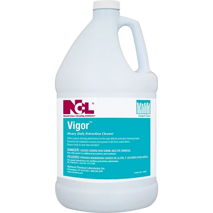 Large-scale contract cleaners with truck-mount carpet extraction cleaners will benefit from the extreme power of NCL VIGOR to aggressively clean professional carpets. Offers superb cleaning performance for the most difficult extraction cleaning tasks. Powerful soil solubilizers remove even ground-in dirt from carpet fibers. Rinses freely and easily to save time and labor.