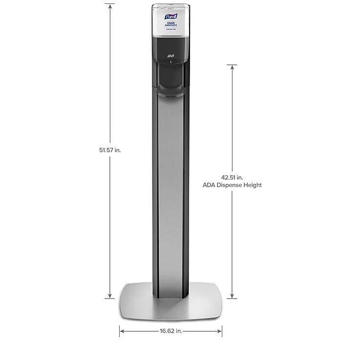 The PURELL MESSENGER ES8 Floor Stand promotes your focus on well-being with a freestanding design that can be placed nearly anywhere in your building. It’s an ideal solution for high-traffic areas, including reception, waiting rooms, and hallways. The included touch-free ES8 dispenser provides an easy and elegant way to access America’s No. 1 hand sanitizer brand. Place where guests, customers, and patients need hand sanitizer and make hand hygiene available anywhere. The low-profile baseplate is designed to be lightweight, allowing you to quickly move and help clean surrounding areas. Sturdy silver baseplate also hides dirt and always looks good. Uses PURELL ES8 Advanced Hand Sanitizer 1200 mL refill.
