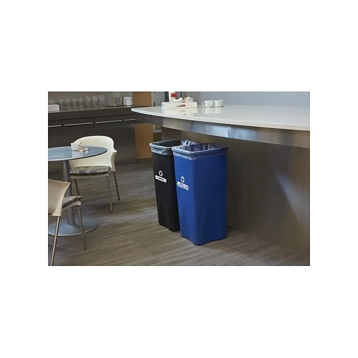 Place this Rubbermaid 23-gallon recycling container in high-production areas of your workplace to take care of recyclable waste. You get the satisfaction of helping the environment by reducing pollution caused by waste, while also keeping your work area as neat. The container’s square shape and desk-high height fit neatly into tight spots when space is an issue, but it’s narrow form ensures that it does not get in anyone’s way. The blue color and white recycle symbol distinguish the container from waste bins.