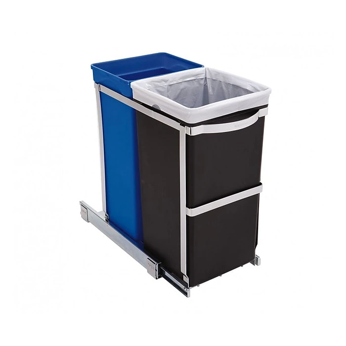 - Neatly sort your trash and recyclables in this dual-bucket recycling trash can