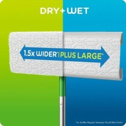 The Swiffer® 92816 green floor mop starter kit makes cleaning large areas quick and easy. Kit contains X-large sweeper, 8 dry sweeping refills and 2 wet mopping refills. It traps and locks even more dirt, dust and hair with each swipe. The 24″ ergonomic handle with easy grip, is made of aluminum for enhanced durability. The 360 deg swivel head cleans dirt even in hard-to-reach places.